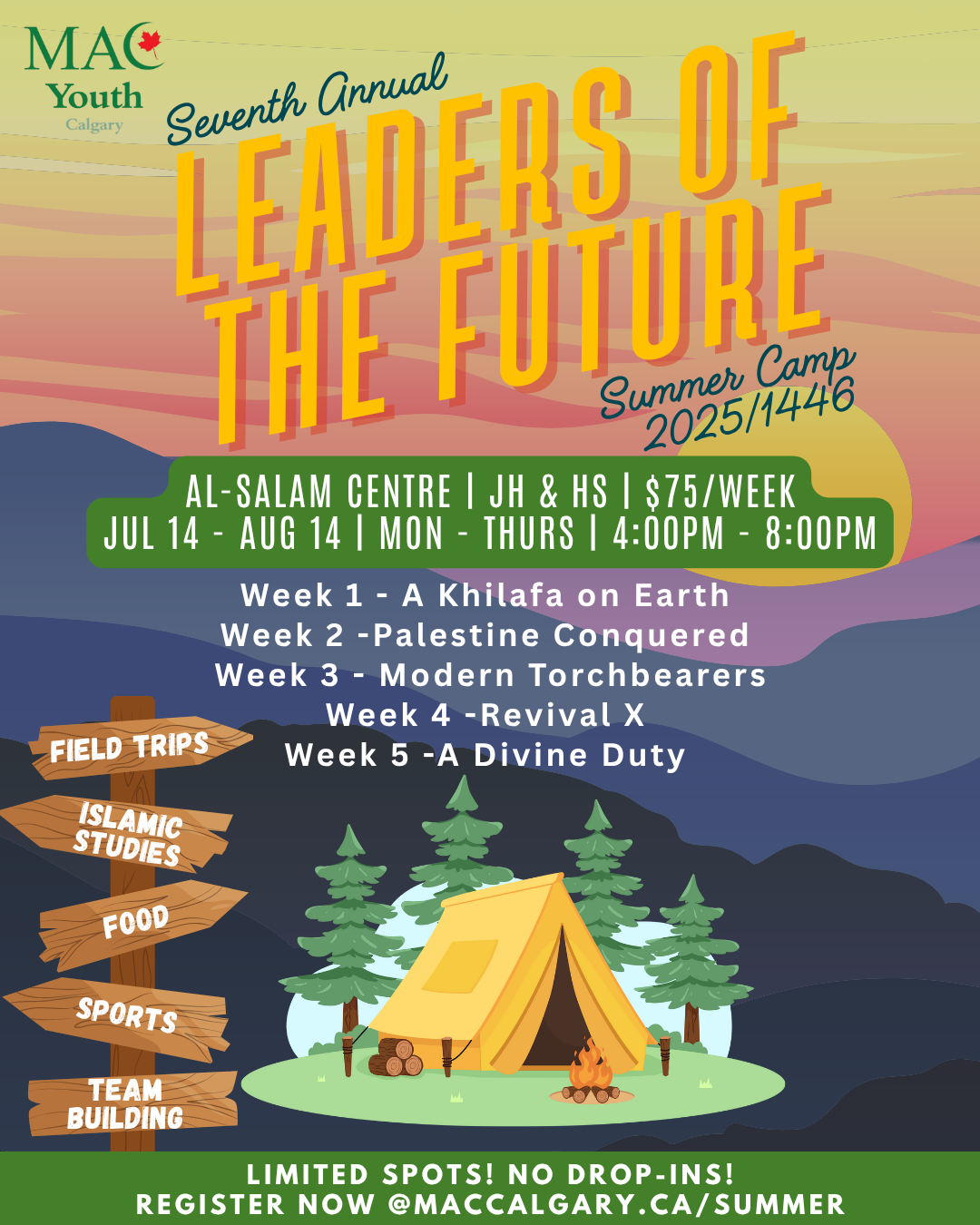 | Camp Days: Mondays to Thursdays | Camp Times: 4 PM – 8 PM | Grades: 7 – 12 Youth – Youth will be divided based on gender | Location: Al-Salam Centre (6415 Ranchview Dr NW) | Fee Per Child Per Week: $75 | What’s Included: Field trip, Islamic Studies, Team Building, Sports, Lunch, etc. | Grade Group: Please make sure to register your child in their CORRECT grade group as NO switching will take place.