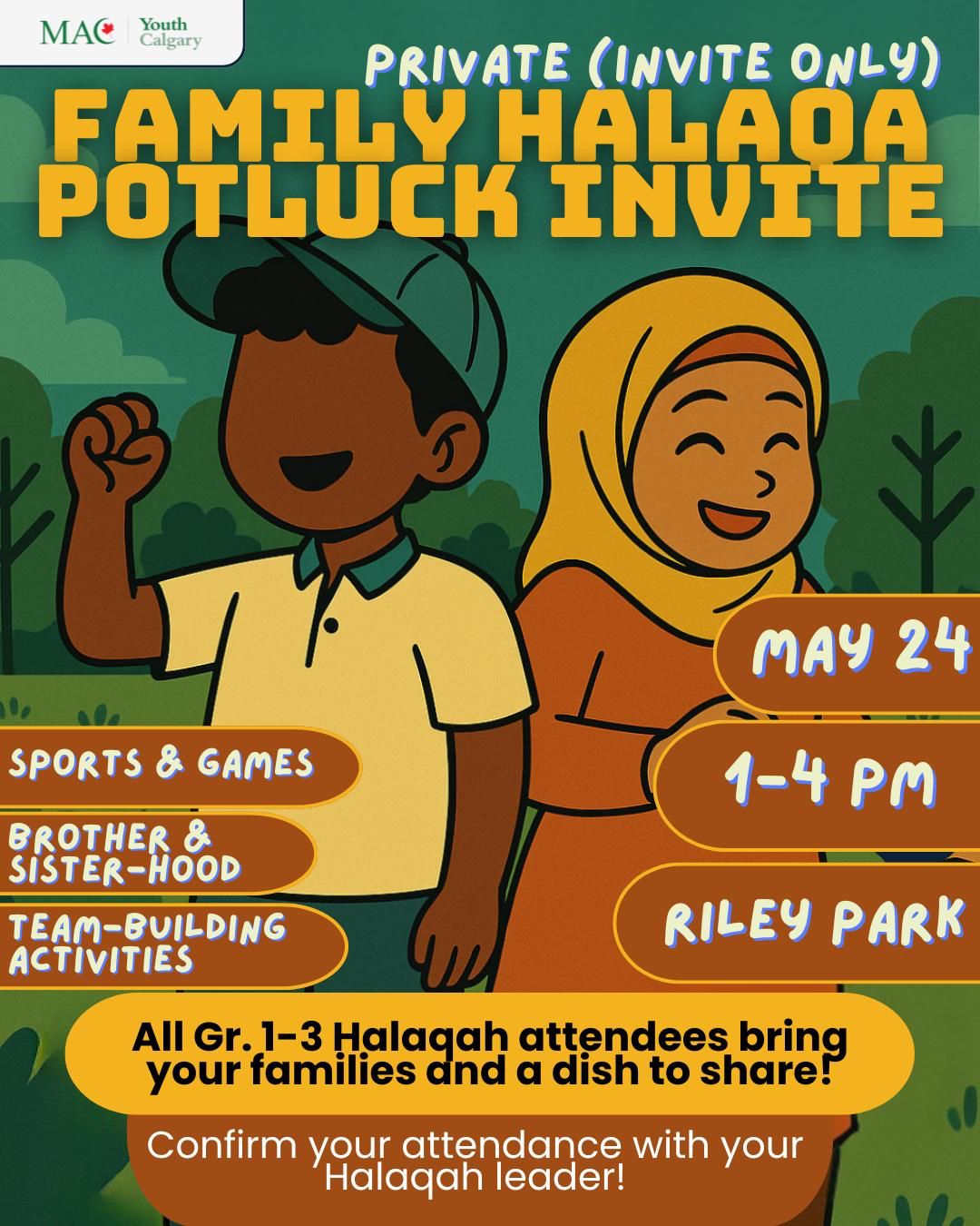 Date: Saturday, May 24, 2024 | Time: 1:00 PM – 4:00 PM | Location: Riley Park, Calgary | Who It’s For: Families with children in Grades 1–3 | Activities Include: Sports & games, arts & crafts, bonding & team-building, and a special Grade 1–3 Halaqa | Food: Potluck – please bring a dish to share! | Theme: Come enjoy a fun and meaningful afternoon with your family at our Family Halaqa – a time to connect, learn, and play together!