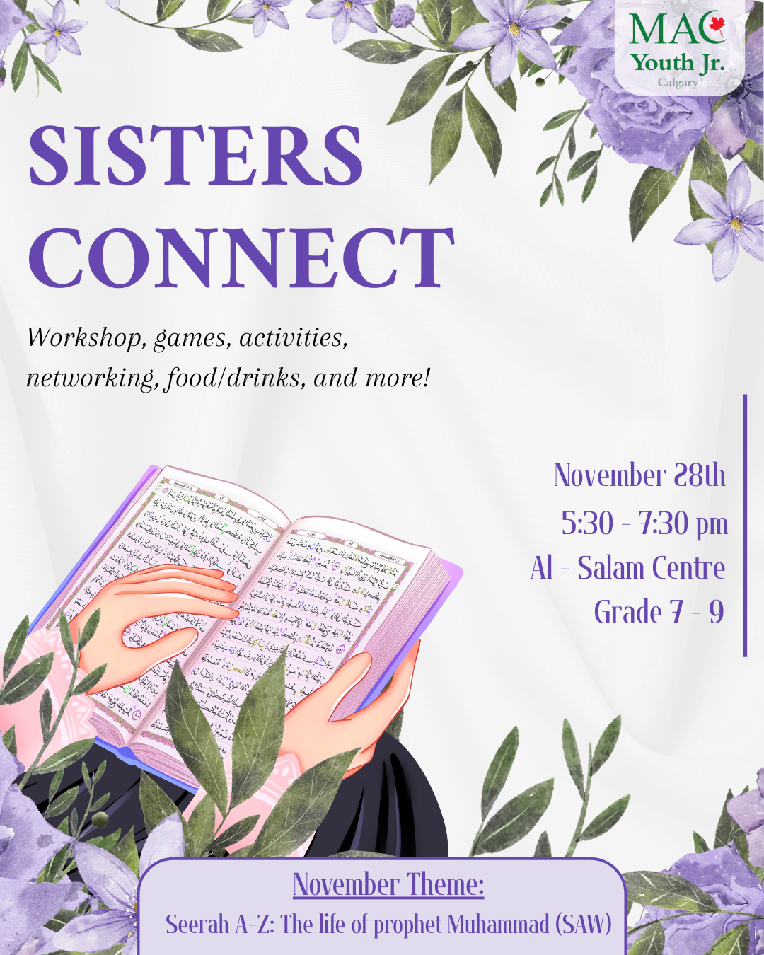 Date: Friday, November 28, 2025 | Time: 5:30 PM – 7:30 PM | Location: Al-Salam Centre (6415 Ranchview Dr NW) | Program: Workshop, games, activities, networking, food/drinks, and more! | November Theme: Seerah A-Z: The life of prophet Muhammad (SAW) | Audience: Grade 7-9 SISTERS only