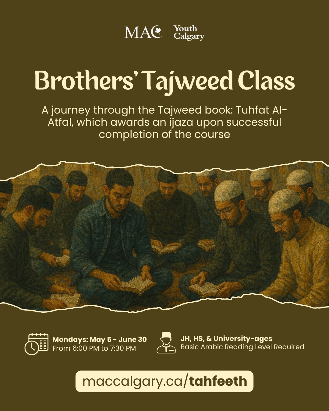 | Dates: Mondays starting September 15 to November 10 | Time: 6:00 PM to 7:30 PM | Location: Al-Salam Centre (6415 Ranchview Dr NW) | Grades: 7, 8, 9, 10, 11, 12 and university boys | Book: Tuhfat Al-Atfal | Ijaza: Ijaza given upon successful completion of course