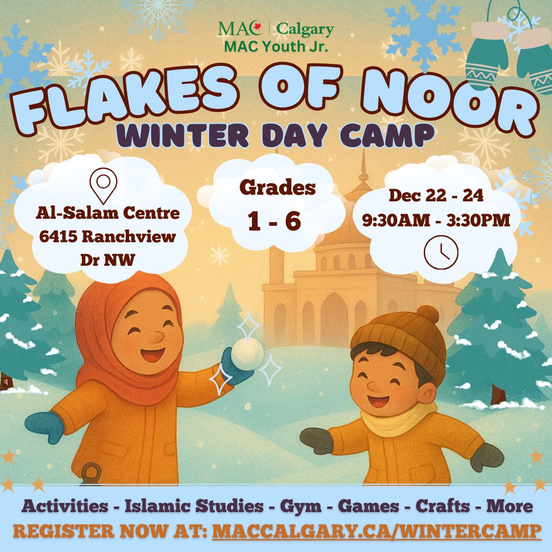 | Dates: December 23 to 26 | Time: 9:30 AM to 3:30 PM | Location: Al-Salam Centre (6415 Ranchview Dr NW) | Registration Fee: $50 per child| Grades: 1 to 6 Boys and Girls | What’s Included: Sports, halaqat, snacks, […]
