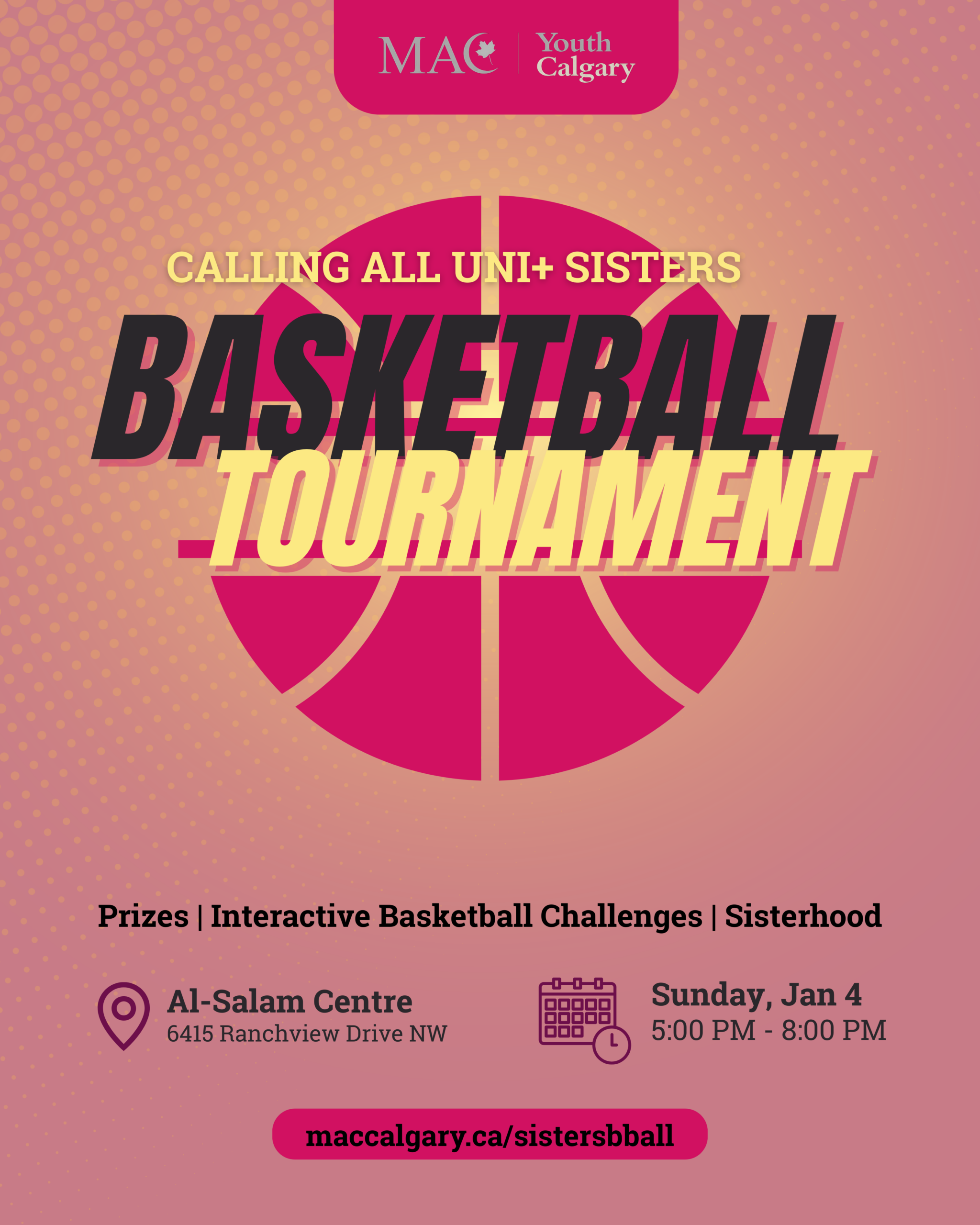 | Date: Sunday, January 4 | Time: 5:00 PM – 8:00 PM | Location: Al-Salam Centre (6415 Ranchview Dr NW) | Program: University Sisters Basketball Tournament | Details: Prizes • […]