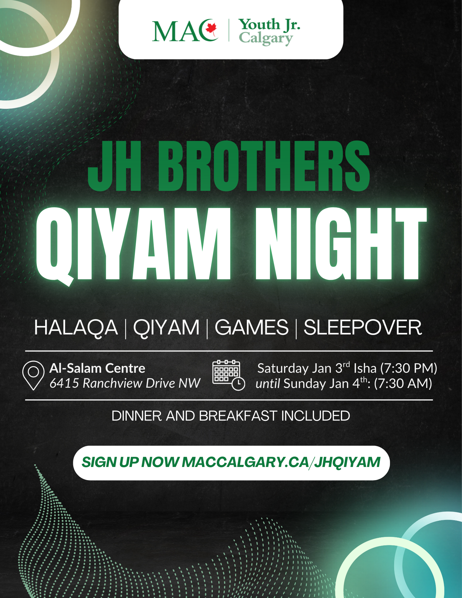 Junior High Brothers Qiyam Night Date: January 3rd (7:30 PM) - January 4th (7:30 AM) | Location: Al-Salam Centre | Age: Junior High | Gender: Brothers| Program: Halaqa, Qiyam, Games, […]