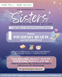 Sisters’ Youth Group is excited to be presenting our much-anticipated annual Ramadan Qiyam! ✨ If you are in high school (minimum grade 9), and are looking for a spiritual and reflection-filled night of sisterhood, activities, Quran & prayer, and of course, yummy snacks and a filling suhoor/sehri, then don’t miss out! Registration is mandatory and there are limited spots.