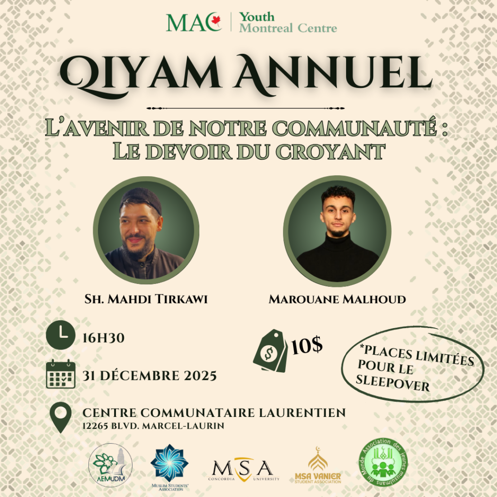 ? Joignez-vous à nous pour le Qiyam Annuel le 31 décembre, une nuit mémorable de prières et de réflexion. Cette année, le MAC Youth Centre, West et South collaborent pour créer une soirée spirituelle et sociale inoubliable! ?